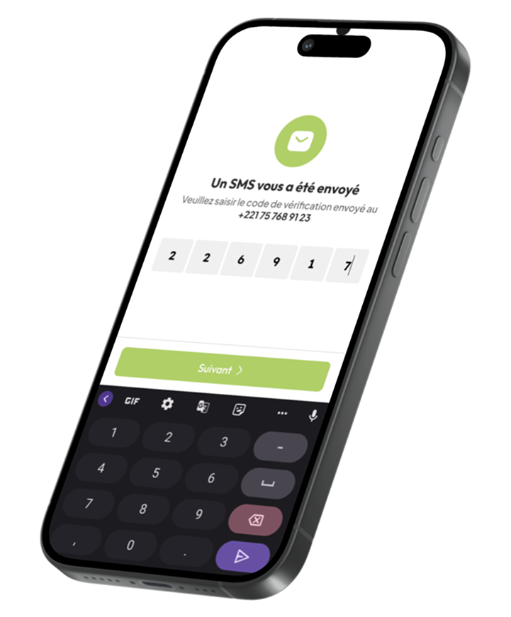 Vous recevrez immédiatement un Code OTP à 6 chiffres par SMS. Saisissez ce code dans l'application pour valider votre identité et sécuriser votre première connexion.