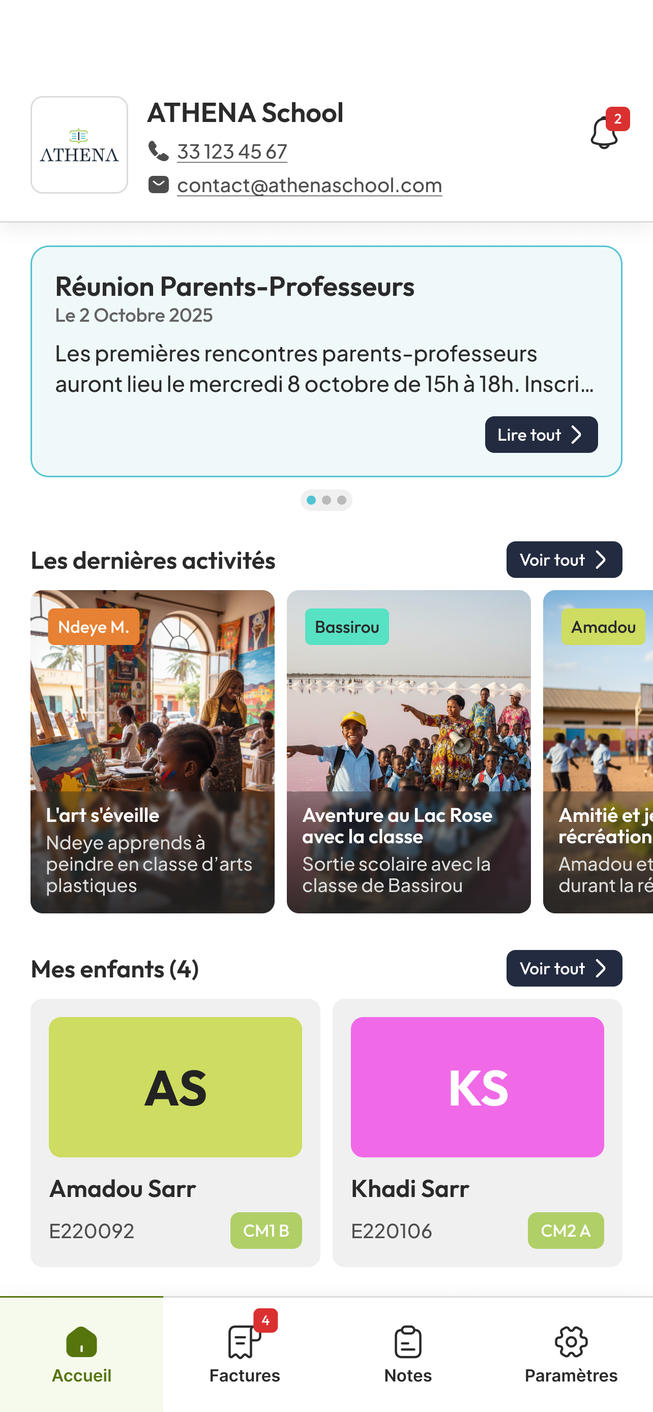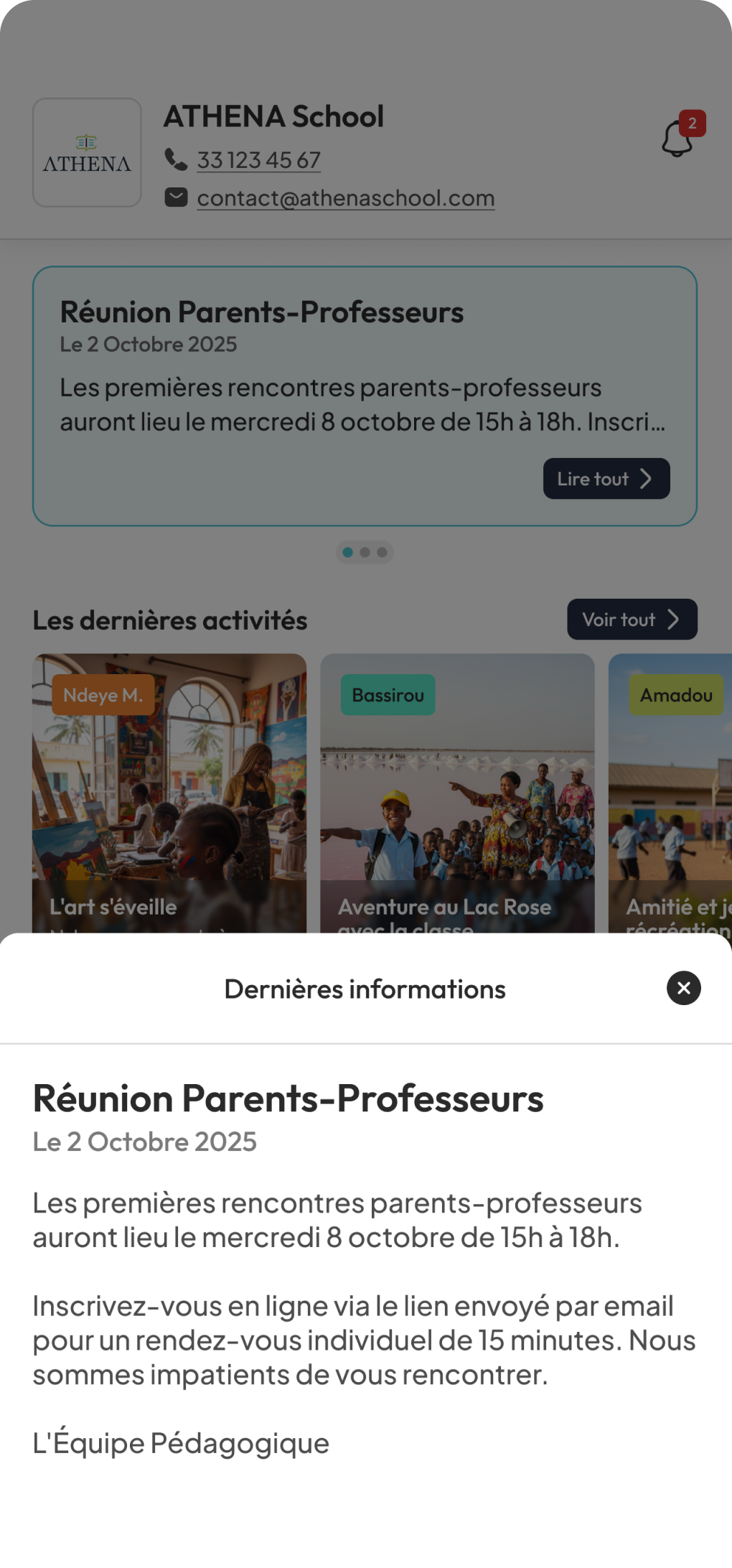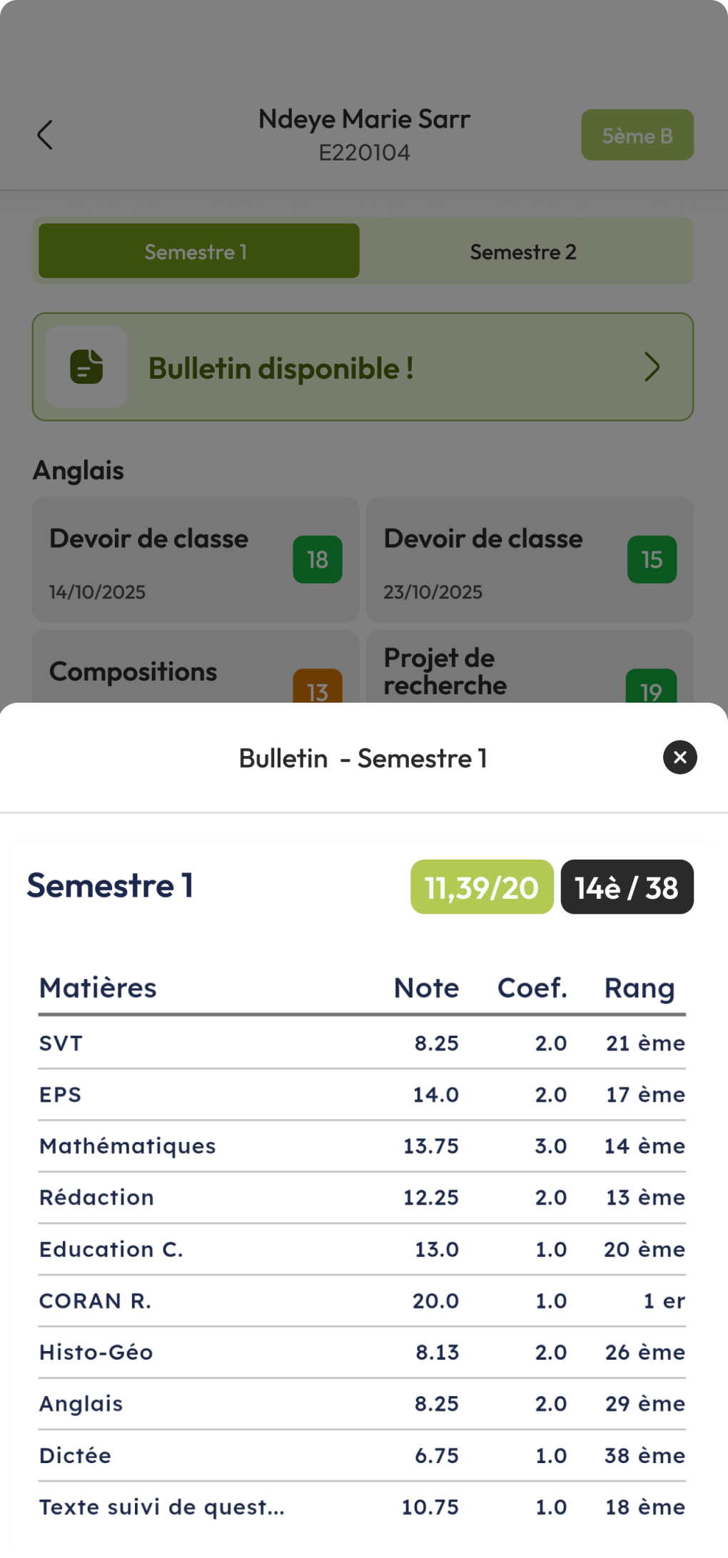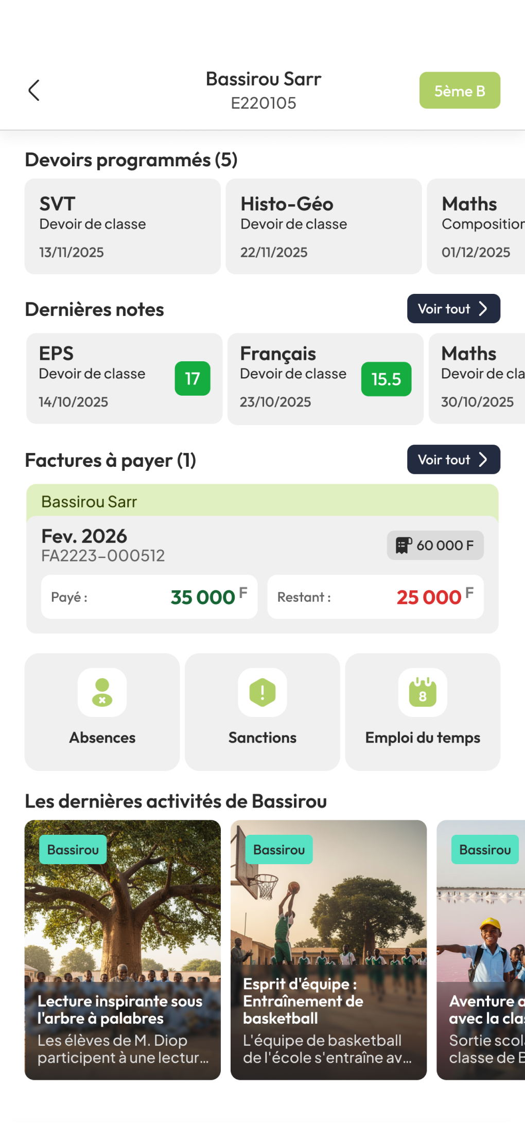 Vous êtes connecté ! L'application s'ouvre sur le Tableau de Bord. Visualisez immédiatement l'essentiel : les dernières notes, le solde des factures et les communications importantes de l'école.