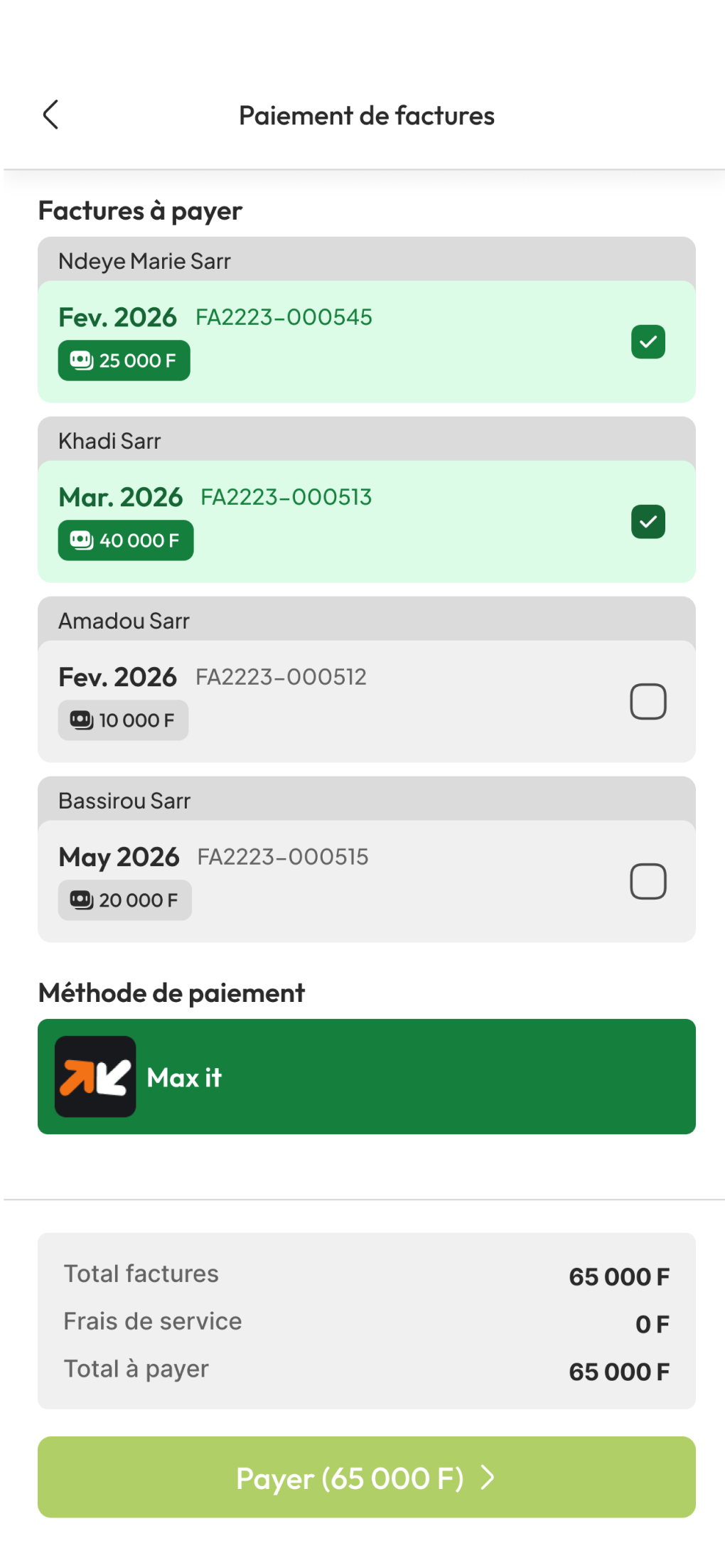 Rendez-vous dans la section Factures de l'application. Vous verrez l'état de vos factures et un bouton <b>Payer</b>. Suivez les instructions pour sélectionner votre opérateur Mobile Money et finaliser la transaction en toute sécurité. Un reçu numérique sera immédiatement disponible.